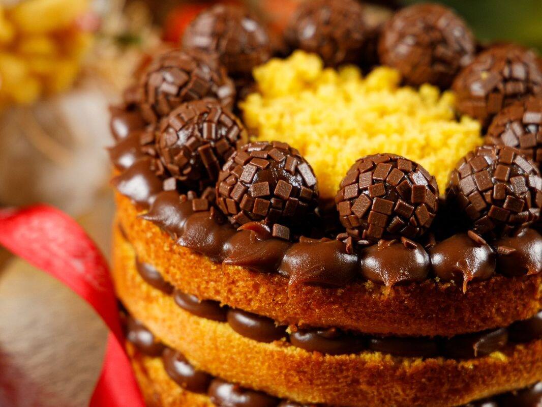 Delicioso bolo de cenoura em camadas com recheio de brigadeiro. Peso: 1kg Produto Congelado-Vai embalado no acetato com um laço